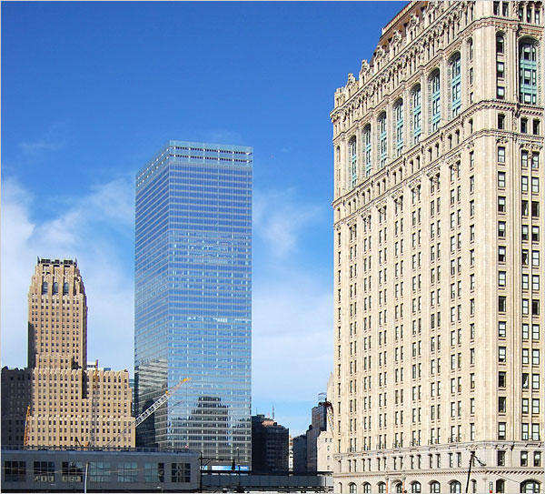 That happened last Thursday, when the 52 floors of 7 World Trade Center faded into the cloud-flecked blue of a late summer afternoon. Its masonry neighbors (140 West Street and 90 West Street) stood out in contrast.