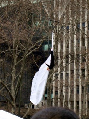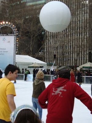 The threat of death must be one of the oldest methods on the planet used to draw a crowd. Apparently, they don’t think that being able to ice skate in the middle of Midtown Manhattan in Bryant Park is enough to attract the tourists. They hired a pretty girl to entwine herself in a white scarf, suspend herself from a balloon and perform an aerial ballet.