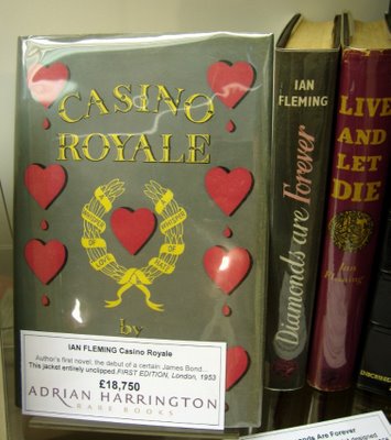 This is a first edition of Ian Fleming’s Casino Royal—the first (and most violent) Bond book. The jacket was designed by Fleming and the phrases in the wreath reads: A Whisper of Love. A Whisper of Hate. I love that. The price is a measly £18,750.
