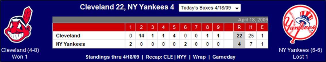 * My beloved Indians inaugurated the new $1.5 billion Yankee Stadium by scoring 14 runs in the second–the most runs ever scored in a single inning in the 96-year history of the Yankees. Way to open your new park, “Legends.”