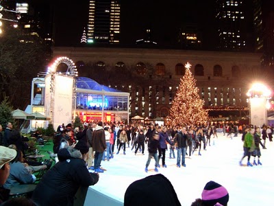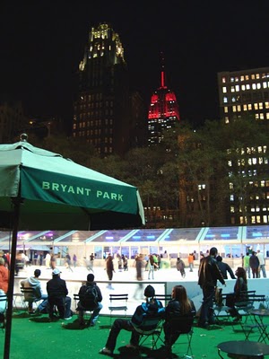 Here’s the beautiful Bryan Park skating rink, all up and running. The building in the background is the back of the big New York Public Library on Madison and 42nd. The front of the building is guarded by two stone lions, Patience and Fortitude. Unfortunately, the statues are so old and frail that they can no longer hang big wreaths around their necks.