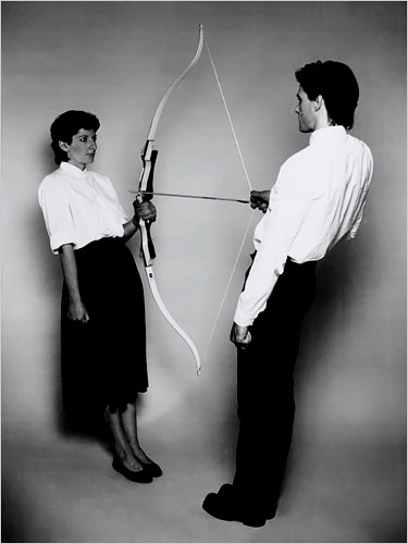was a video of Abramović on the wrong end of an arrow. The piece required that someone hold a taunt bow with the arrow pointed at her heart.