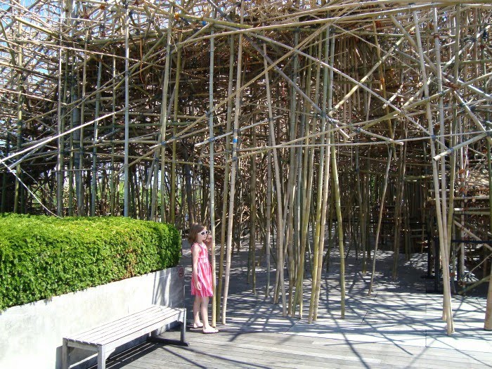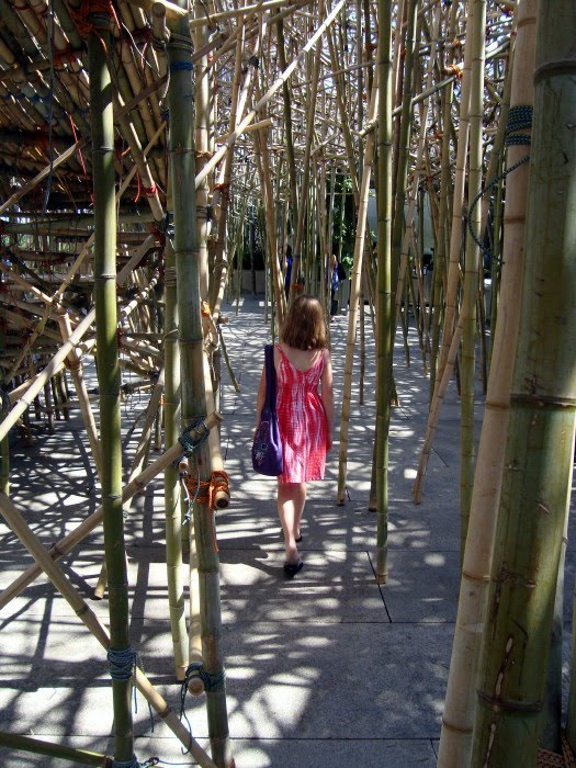 This year, Doug + Mike Starn have mounted Big Bambú. The project consists of fresh cut bamboo poles lashed together with nylon rope. The construction of the sculpture is ongoing and will continue throughout the summer. It closes October 31st, which is pretty late in the year for this sort of thing.