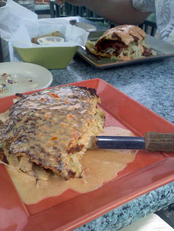 10. kykn: The boxty might have been helped if they added a few cicadas. TB: I wanted to engage the woman in a conversation to ascertain whether or not she was in the family way but decided against it.Map: Thanks very much for the pronunciation guide. I needed that. The sun dried toms were the hook that made me order it. It didn’t work.Nutty: It doesn’t make any sense. I love sausage but am put off by haggis. What’s the difference?!ES: On the menu the boxty sounds like it’d be a real treat. American restaurants routinely serve over sized portions. Perhaps that accounts for its size. And, to me, the bug looks like a space alien.