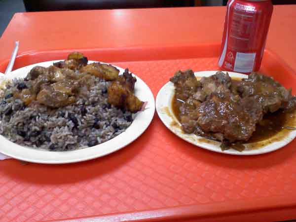 Is ox tail actually from an ox or is that just the name of it? Who the hell raises ox? And I’ve never heard of ox meat for dinner. Are they raised simply for their delicious tails and to pull carts? I’ve never seen an ox. Do they even have tails? God, they’re good. That’s a plate of black beans, rice and fried plantains on the side. I glamor the girl behind the counter, so she always pours a little of the ox tail gravy on my rice and beans.