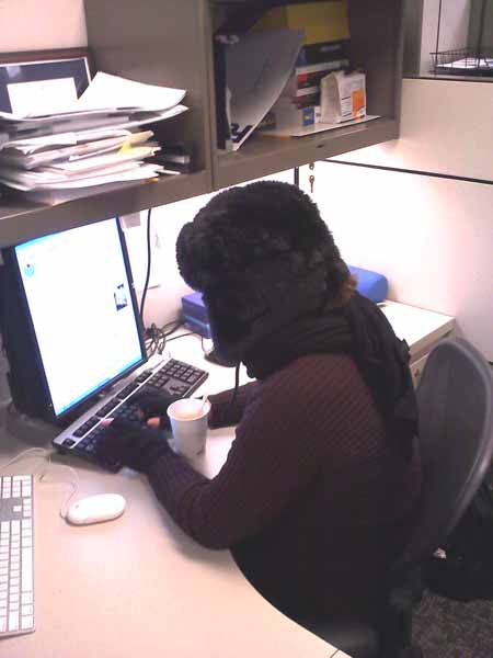 I work in Soho in a building that use be a printing plant. Lots of buildings down here that were purposed for heavy industry have been converted to living and office space. Because they’re not traditional skyscrapers and more factory-like, it occasionally takes a while for the heat to kick on in the winter. This is my colleague: