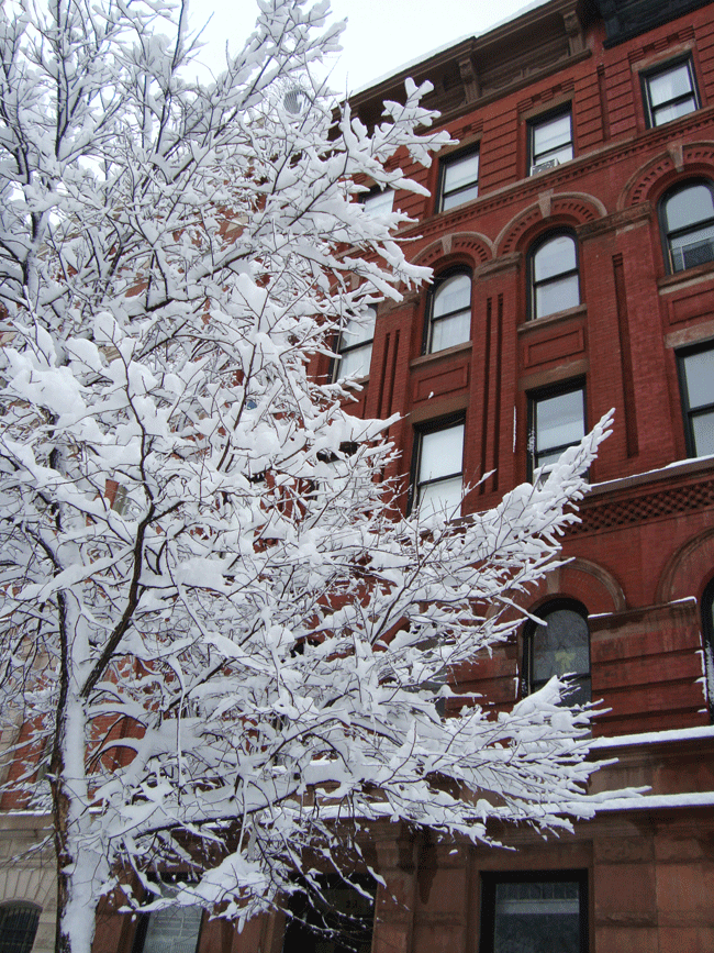 Here are some pics. These were taken in Soho where my offices are. I was particularly struck by the contrast of the white branches against the red brick.