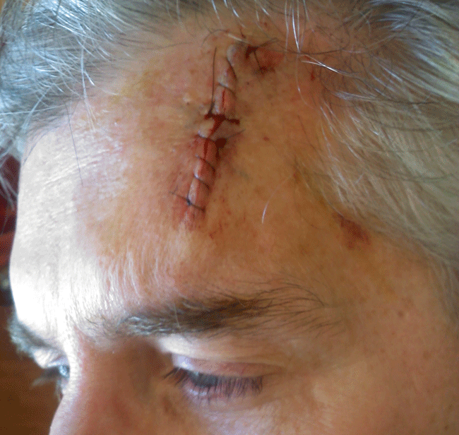 I’ve received a few random comments and e-mails inquiring about the status of the wound on my forehead from when I had a small piece of skin cancer cut out a few weeks ago. [Strong content. View discretion is advised.]