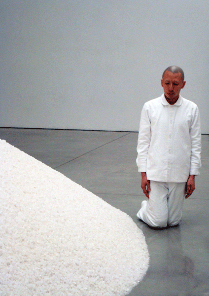 10. Does Terence crawl all day? I’m curious about what happens to the salt when the installation is over. I saw the clip of him crawling. It reminded me of those Tibetan singing bowls I used to play with. How long did you stay for? Did you find it at all disconcerting? And is it a conscious effort, of late, on your part, to to seek out… meditation-Buddhisty things? (Evidently I’m curious about more than just what happens to the salt:)