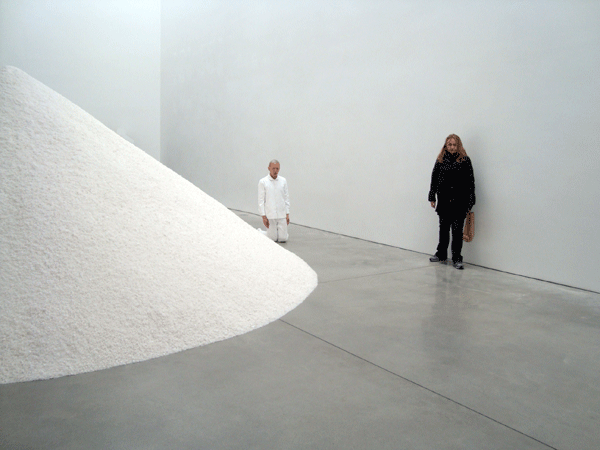 On my lunch hour, I visited the Mary Boone Gallery in Chelsea to see performance artist Terence Koh’s latest work, nothingtoodooterencekoh. In it, a (supposedly) 45 ton pile of rock salt was dumped into the center of the gallery and Koh circumnavigates the pile ON HIS KNEES from the time the gallery opens until it closes. It’s madness.