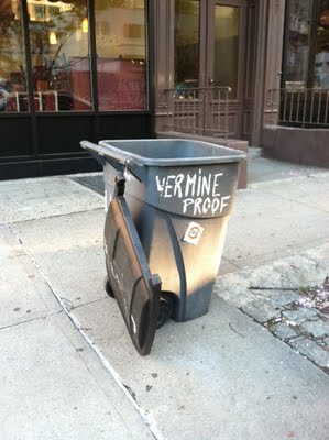 Yeah, vermin proof if the lid is on. What kind of twisted city ordinance requires that the garbage bins that are vermin proof need to be labeled as such? Vermin can’t read. I like the lettering. It looks like the cover of a death-metal CD. I am happy to report that I saw this near the Trump Soho Hotel. Make of that what you will.
