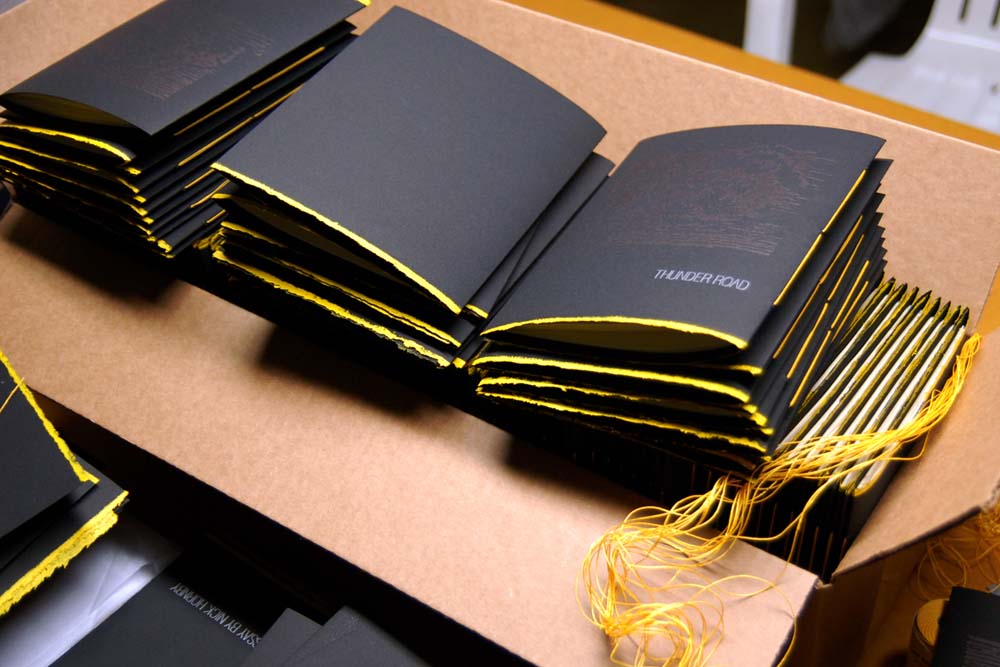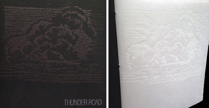 Songbook includes an essay on Bruce Springsteen’s Thunder Road that I think is particularly effective. It’s the standout piece of the book. I was in bookbinding class stabbing myself with a sewing needle trying to perfect a chapbook spine stitch when I had the spark of an idea. Wouldn’t it be cool, I thought, to create a chapbook that married both Hornby’s Thunder Road essay with Springsteen’s lyrics? And do it legitimately, with permission from the artists? Yeah, right. Like that could ever happen.