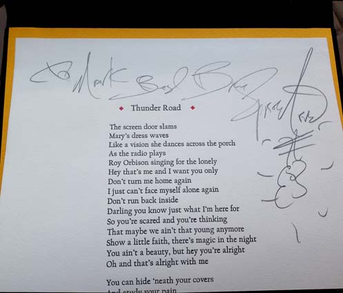 I was moved by their enthusiasm for the project and willingness to create hardcovers. I meditated on how they could be made even more special. I approached Springsteen again and asked if he would be willing to sign the broadsides for just those 26 copies. He politely declined five years ago, but this time he said yes. I dropped the broadsides off at his house and picked them up several weeks later.