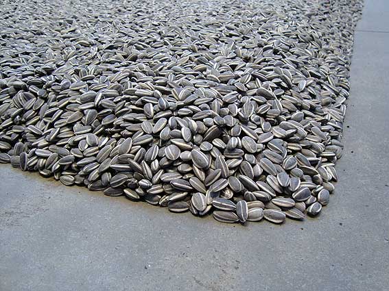 This is a scaled-down version of the exhibit that appeared in the Tate Modern in London in 2010. At that show, the turbine hall was covered about four inches deep with porcelain seeds that were hand painted to look like sunflower seeds. Supposedly, there were 100 million pieces to the exhibit. He employed 1,600 villagers and it took several years for them to create the seeds and then paint them. Originally, it was a participatory exhibit that allowed visitors to walk in the seeds. But as people walked on it, a toxic cloud of porcelain dust rose and that put an end to any contact.