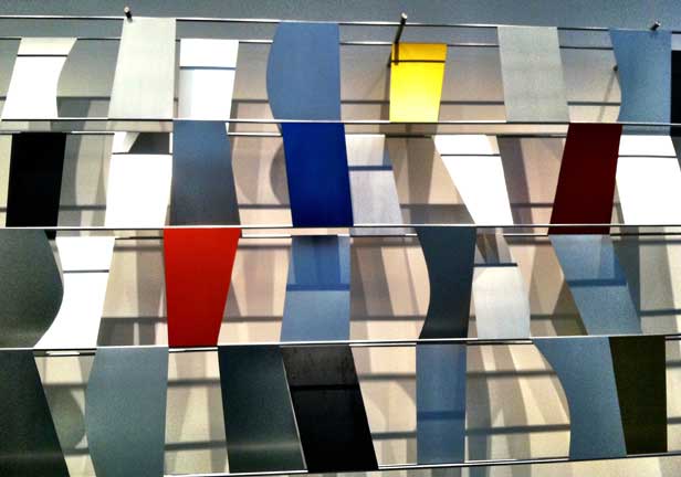 kelly1 It’s made of colored, angled, aluminum panels and rods. If you stand on the other side of the atrium and look at it in its totality, it’s pretty good stuff.
