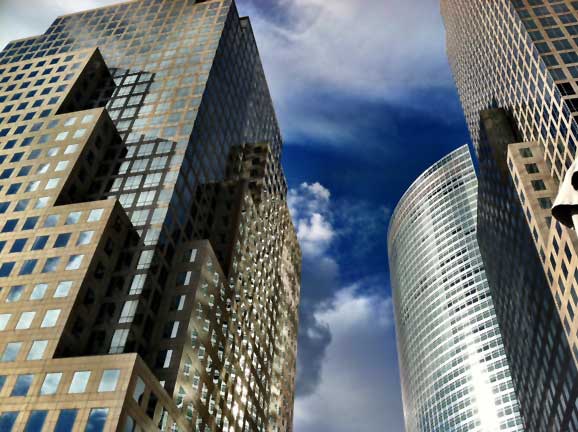 The construction project peeking out in the center is the new Freedom Tower. Christ, I hate that name. It’s too jingoistic for my tastes. It reminds me too much of Freedom Fries. But it’s an architectural home run. Wait ’till you see it.Bonus pic with lovely contrasting angles.