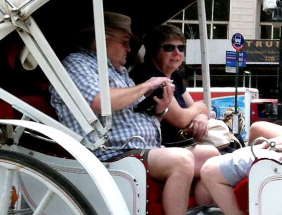 But what do we have here? Surrounded by friends and riding through Central Park on a beautiful, perfect, blue afternoon, he would rather BURY HIS FACE IN HIS iPAD than soak it all in.I couldn’t believe it. I watched as they slowly passed by with my big stupid mouth agape. He wasn’t taking photos. He never looked up once. Why would you even bring the damn thing with you?! And those carriage rides aren’t cheap. They’ll set you back about $80 bucks. He might just as well have stayed in his hotel room alone with his iPad. Or home. This isn’t even the worst case. Yesterday, I saw a father and his young son in a carriage and Dear Old Dad never once looked up from his cell phone. It’s what gave me the idea for this post. Seriously, earthlings, if we don’t change our ways, we’re doomed.