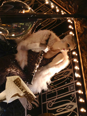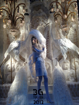 Here are a couple of holiday windows at Bergdorf Goodman. Strangely, they have nothing whatsoever to do with the holiday. The theme is jazz-era/art deco and while lacking in ho-ho-ho-ness, they’re pretty impressive, just the same. You should click on these and blow them up. They’re interesting. This first one should appeal to the white-plumed fetishist in your life.