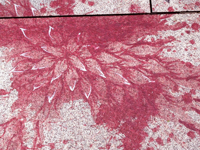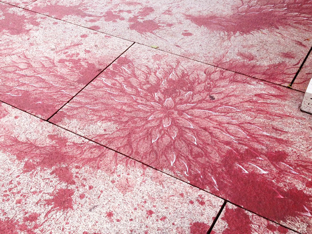 This year, Pakistani artist Imran Qureshi’s work is said to be an emotional response to the violence in Lahore, where he lives. He’s painted a landscape across the stone floor. The images of red foliage is meant to reflect Central Park. Using red acrylics, detailed, delicate leaves were painstakingly, drawn across a huge span of the floor.