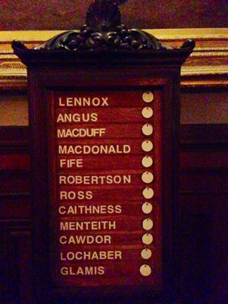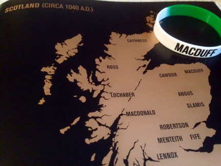 macbeth8The guts of the programs are the same. There’s a map of Scotland ca.1040 showing the location of the clans. I was a Macduff, which is brilliant because Macduff—my kinsman—is the guy who slices Macbeth’s head off. It’s a rough trade for the pleasure of doing that because Macbeth has Macduff’s wife and children murdered.