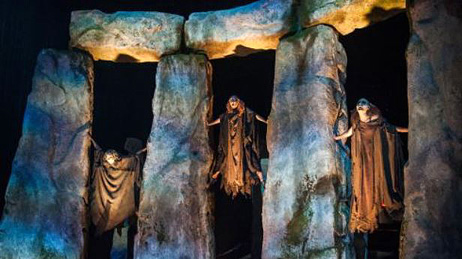 macbeth12The audience enters their seats by walking around giant stone columns. There are risers on either side of the stage looking down on the performance space.
