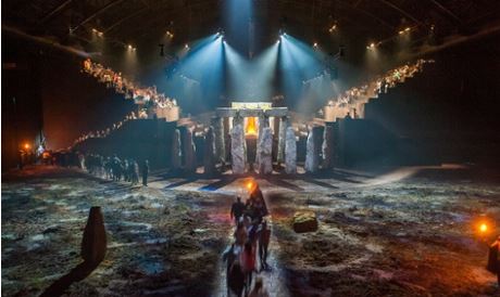 macbeth10All of these pre-show festivities effectively pulled me into the performance before I ever laid eyes on the stage. One by one the clans are called. You march up to the thick wooden doors of the drill hall. A cloaked druid asks, “What clan is this?” Everyone shouts, “MACDUFF!” He tolls a bell and the doors slowly swig open to reveal a Scottish heath. Another cloaked druid carrying a torch leads you into the dark hall. A mist hangs in the air. It’s cool and clammy. You walk into the cavernous hall across a stone path. Dirt, rocks, puddles and mud are on either side of you.