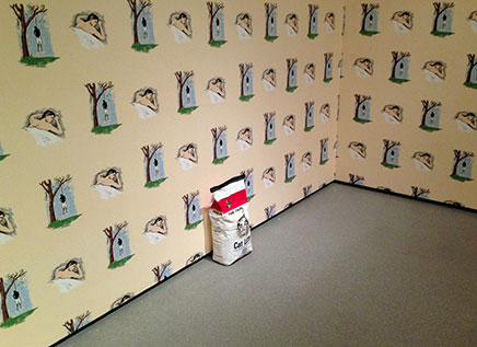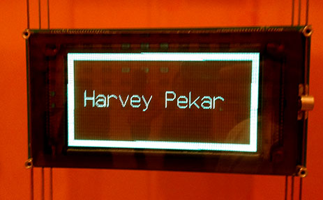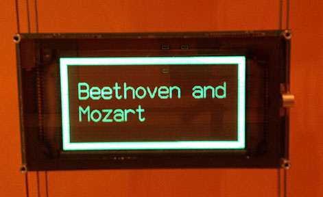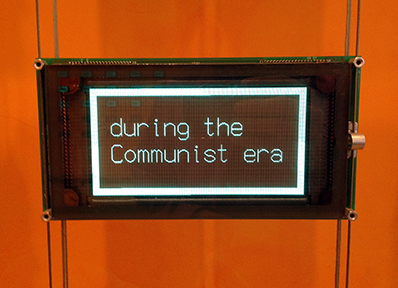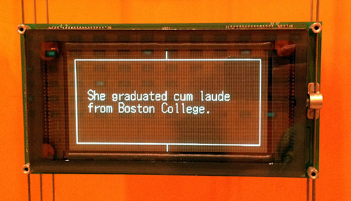 The image situates the sun, moon and stars as they would appear at the actual Nevada site over the course of a year. The view slowly morphs from ground to satellite image every 60 minutes. The view is constantly, albeit, very slowly, changing throughout the course of the exhibit. It might be more interesting if they sped up the movement a bit. You don’t see much change just standing there.