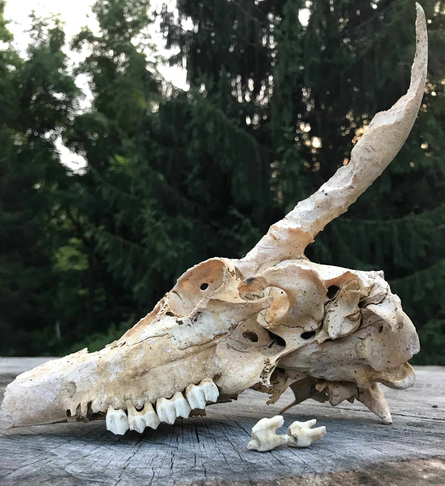 The daughters were walking through the woods with some friends and found this skull. It’s a deer. Well, we presume it’s a deer. What else could it be? I set it on this stump in an attempt to Create Art and two of its teeth fell out.