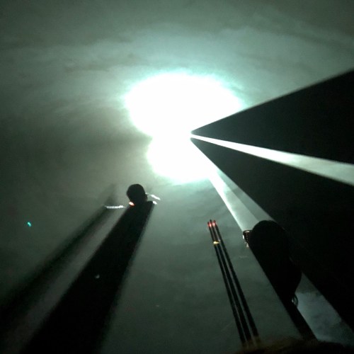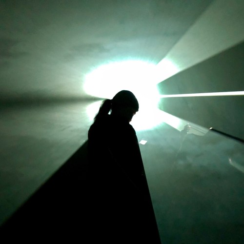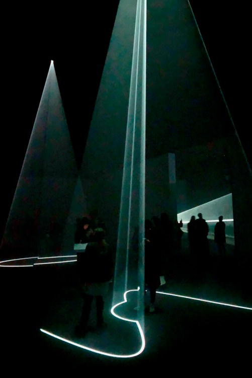 I dragged my wife + daughters to Pioneer Works, a warehouse in Brooklyn, for Anthony McCall’s Solid Light Works; four light pieces oriented vertically in a large space and two shining horizontally in smaller spaces. A mist hangs in the air so the beams are visible.