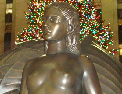 Outside in Rockefeller Center, people flock to see the big tree. But by focusing on the tree, they risk missing the smaller touches, such as this stature of a beautiful (and, dare I say? erotic) naked nymph above the skating rink.
