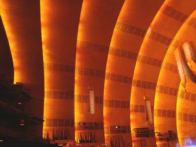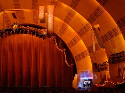 Here are two shots of the cavernous interior. How do you like that lighting? The spotlight is on one of the two “Mighty” Wurlitzer pipe organs on either side of the stage. As you walk to your seats, you are blasted with Christmas carols. You can feel the notes in the lower registers in your chest.