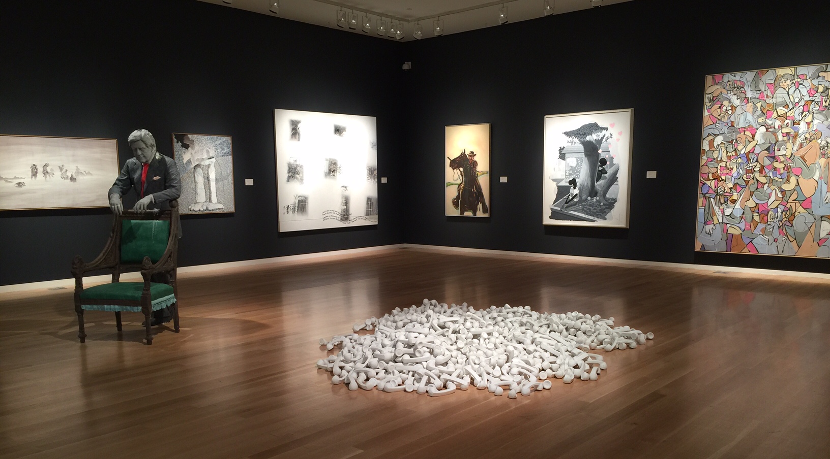 That’s the drama of this season’s auctions. Are you ready for the comedy? Let’s kick the door open and break the hinges with these excruciating exercises in pomposity. On the left, the word “PLEASE” stenciled six times onto a sheet of aluminum. On the right, four shop vacs in a Plexiglas case with neon lights.